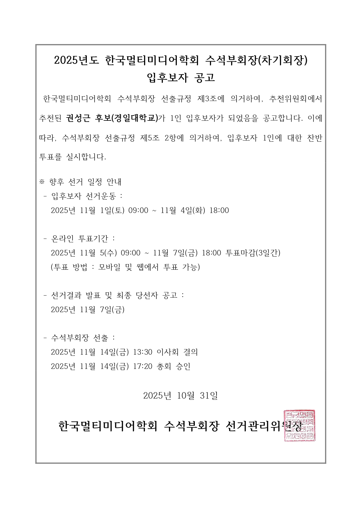 한국멀티미디어학회 수석부회장 입후보자 및 선거 일정 공고