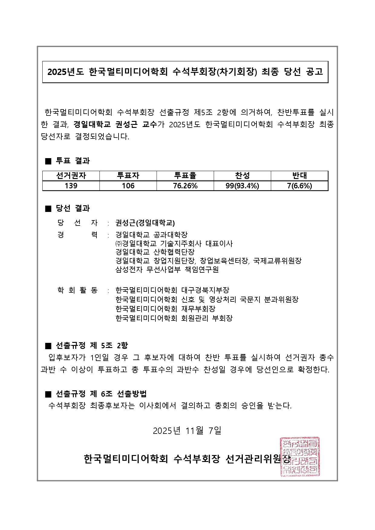 [한국멀티미디어학회] 2025수석부회장 당선 공고
